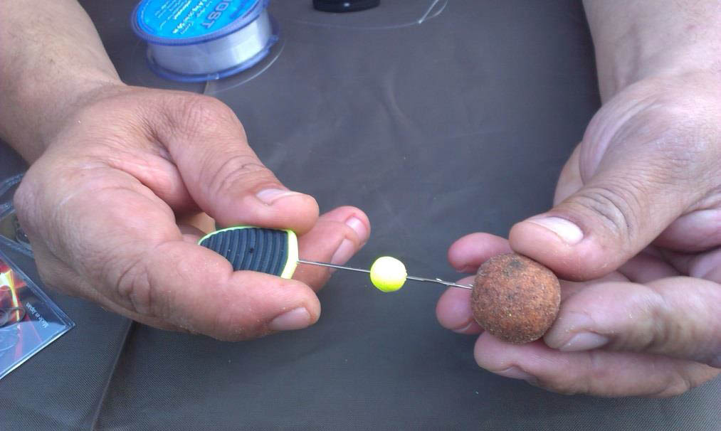 A fűzőtűre egy szem pop-up bojlit fűzűnk |